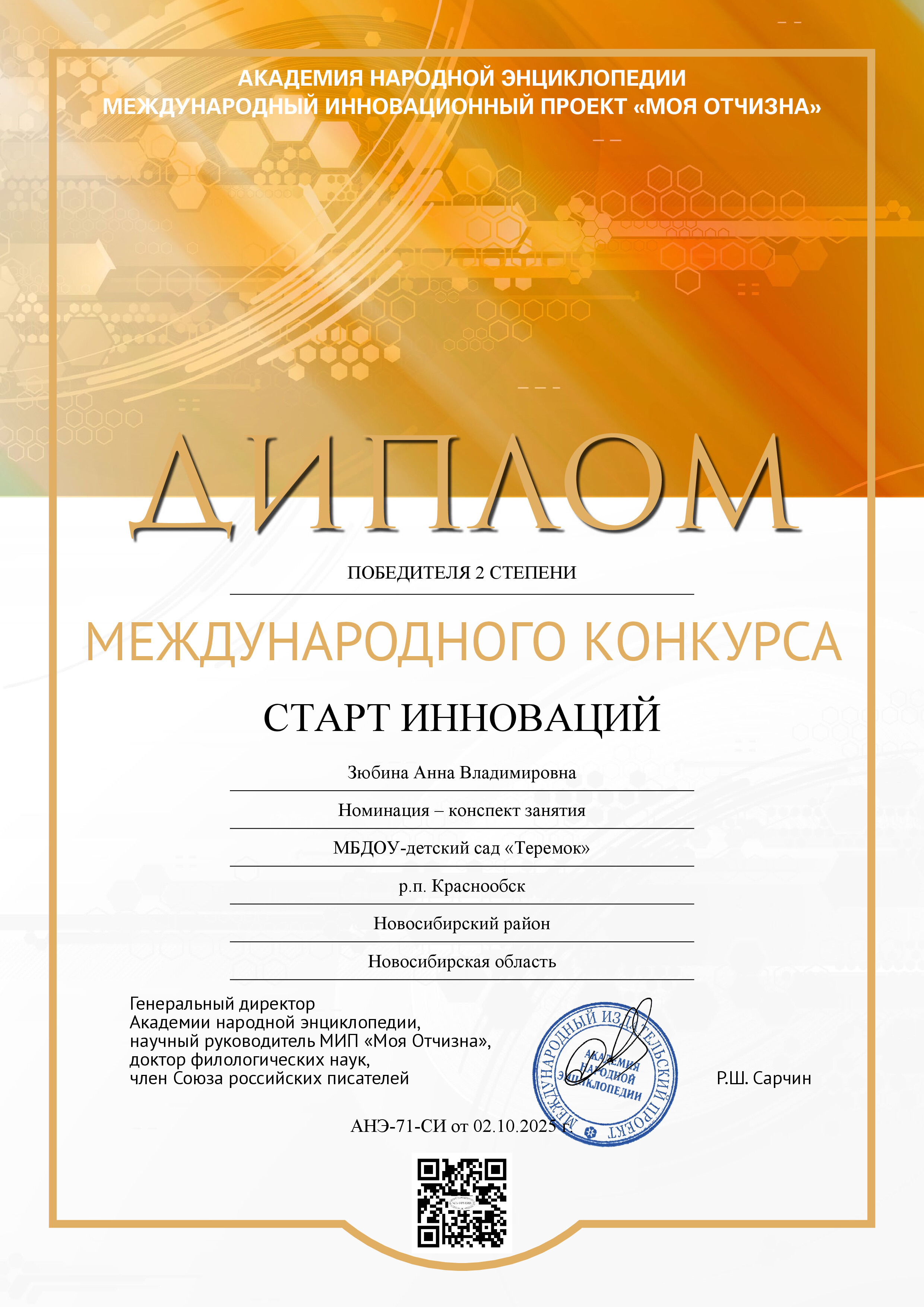 Диплом победителя 2 степени Международного конкурса Старт инноваций в номинации Конспект занятия