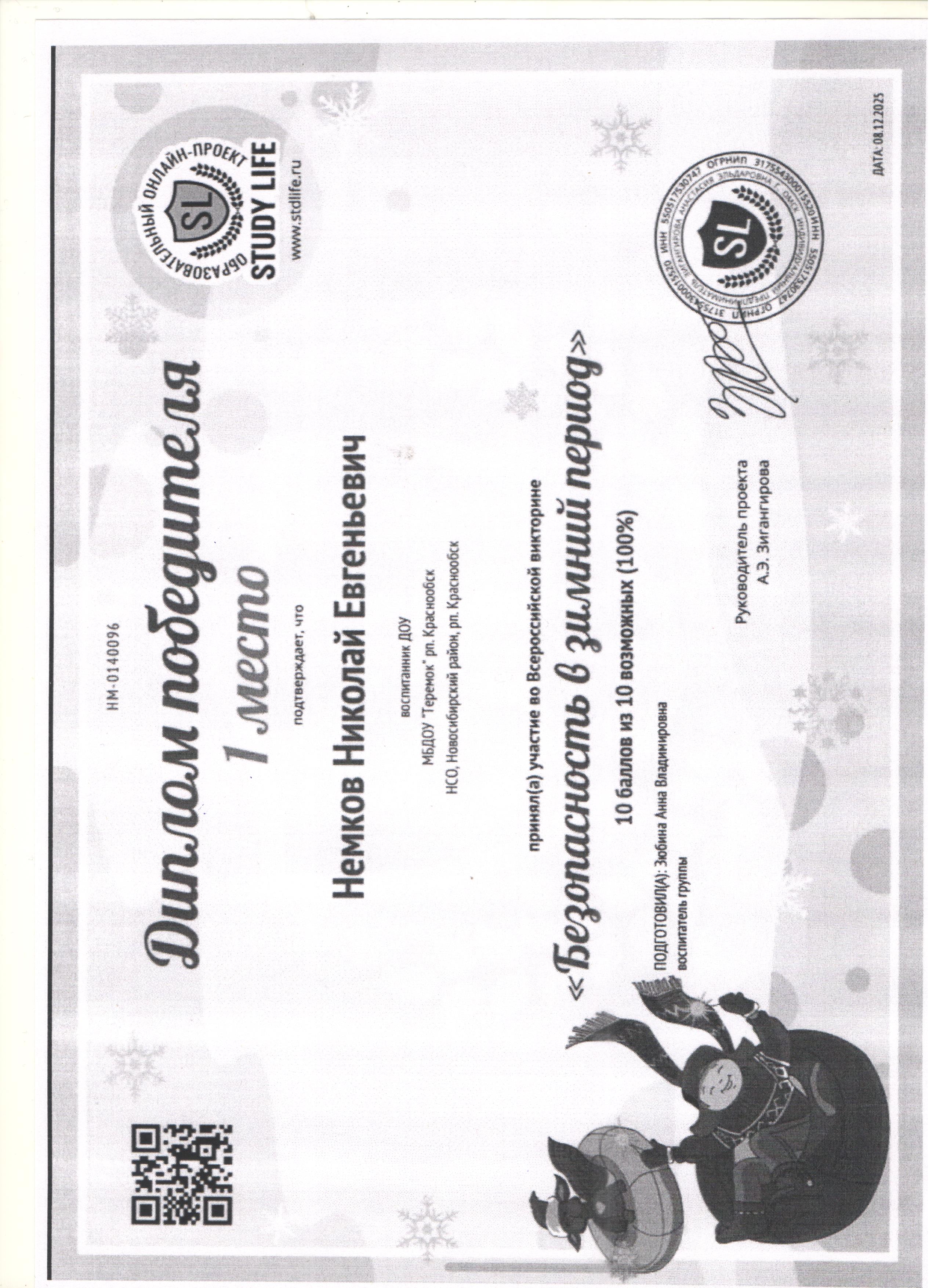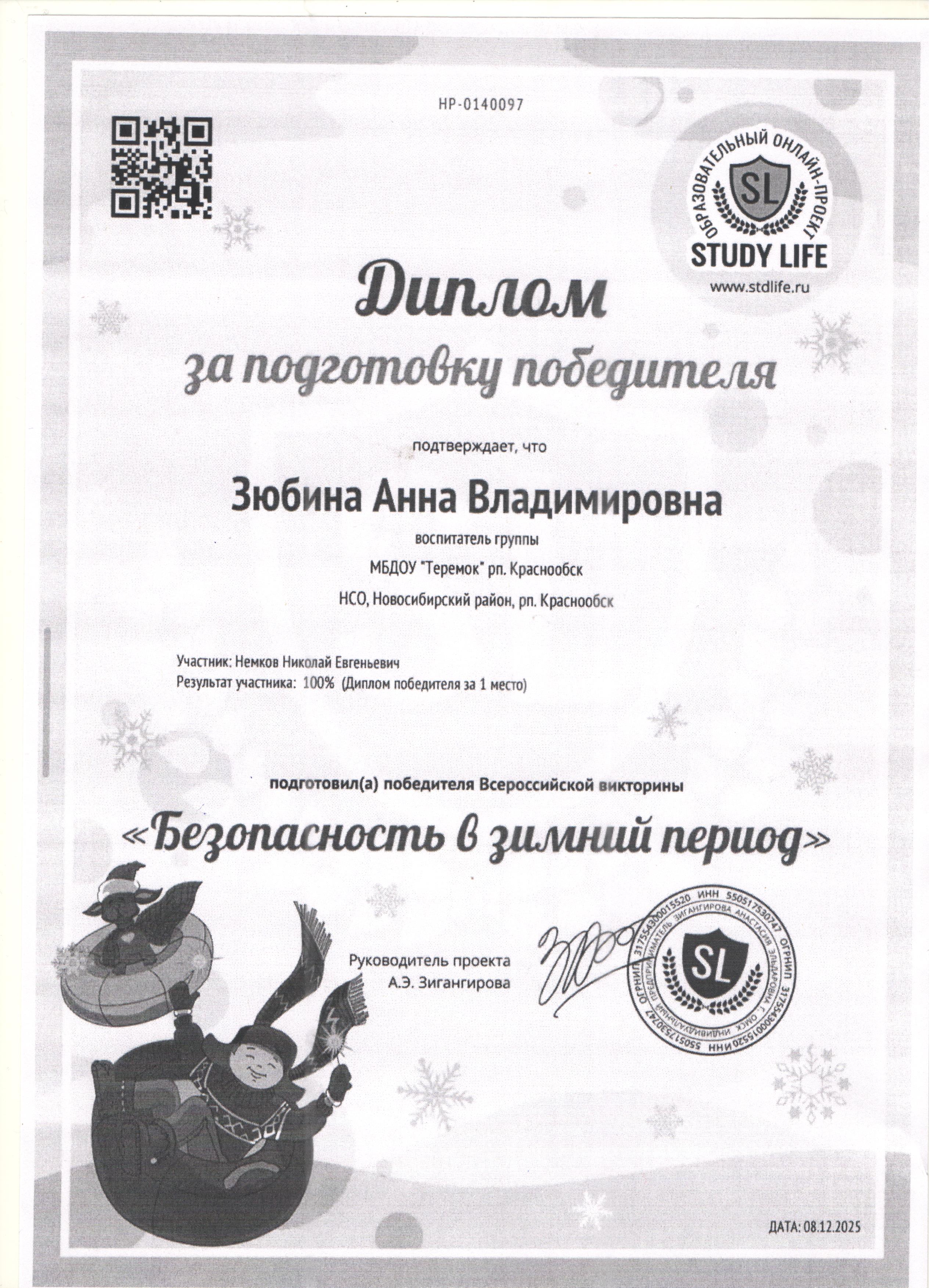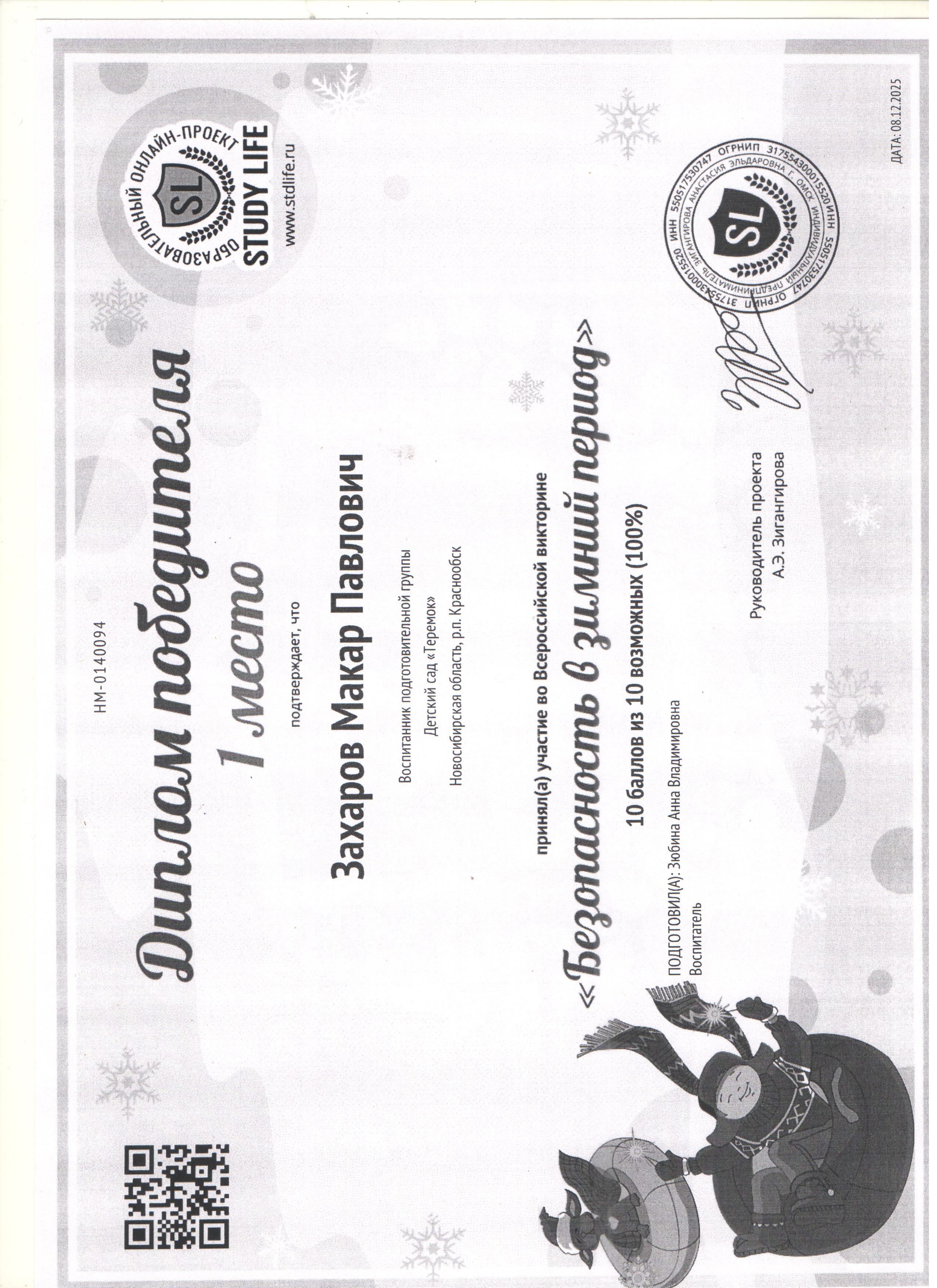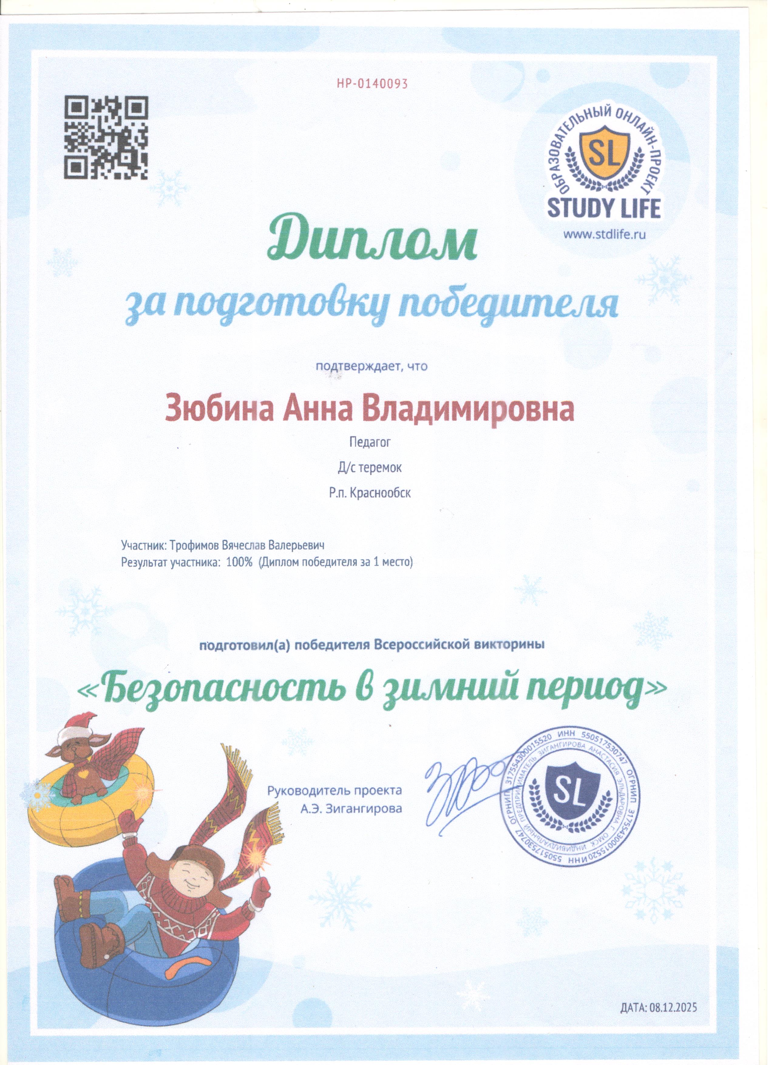Диплом за подготовку победителя Всероссийской викторины "Безопасность в зимний период"