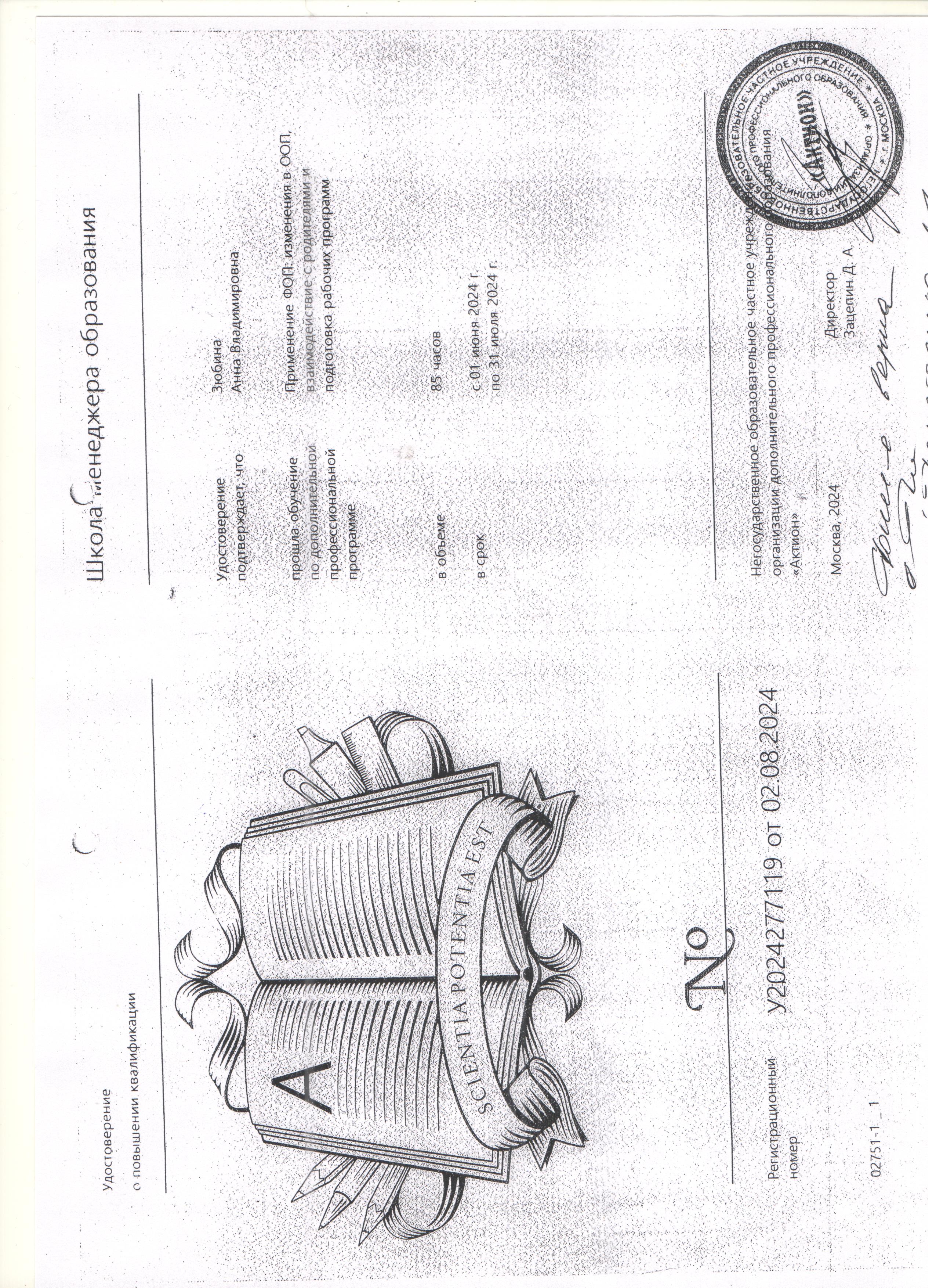 (Негосударственное образовательное частное учреждение организации дополнительного профессионального образования "Актион". 85часов. Направленность: иное).