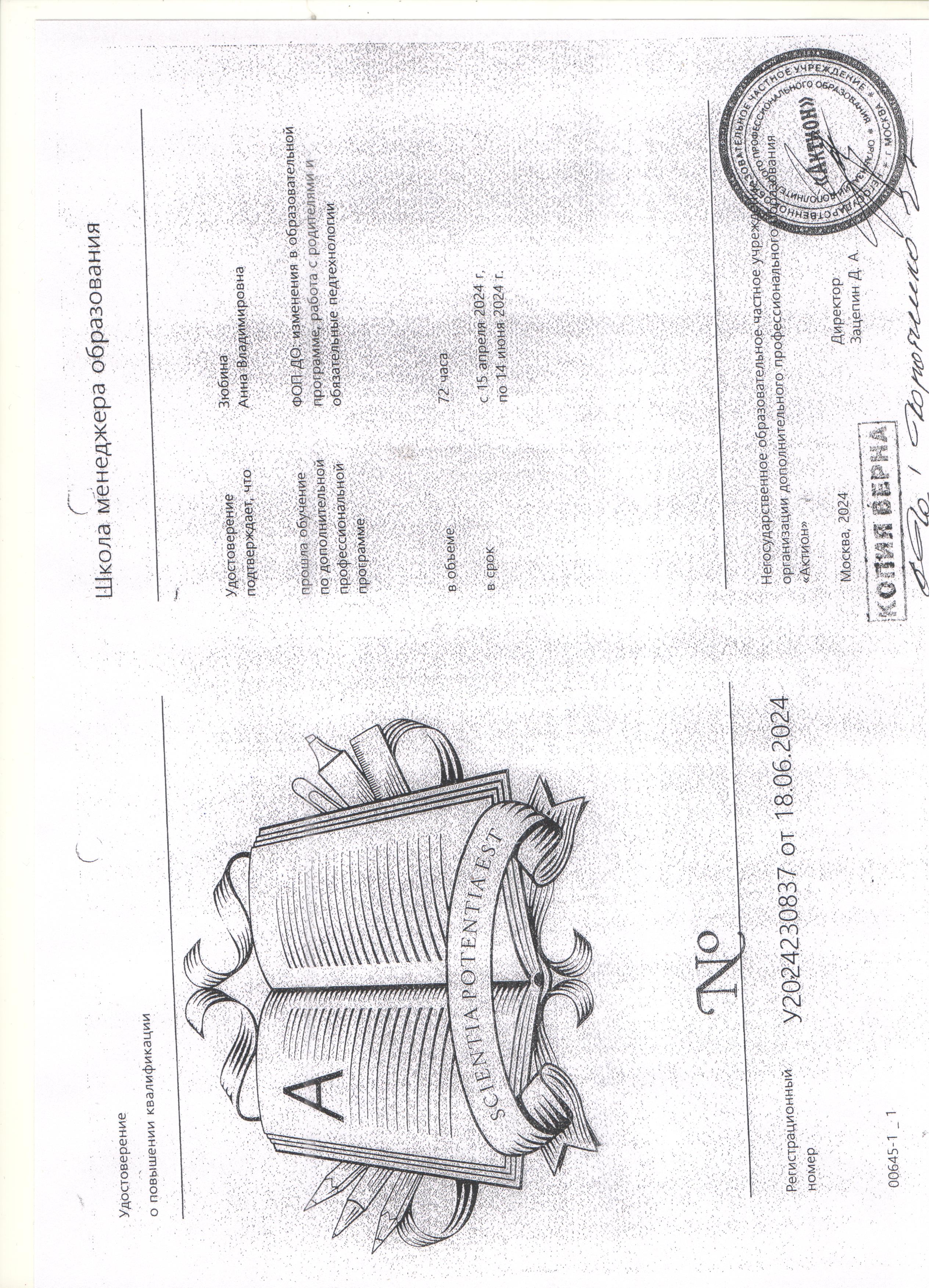 (Негосударственное образовательное частное учреждение организации дополнительного профессионального образования "Актион". 72часов.).